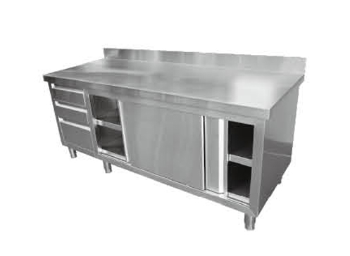 1、不銹鋼帶背操作臺,左邊三個抽屜存放工具,右邊推拉門,一體多用處操作柜