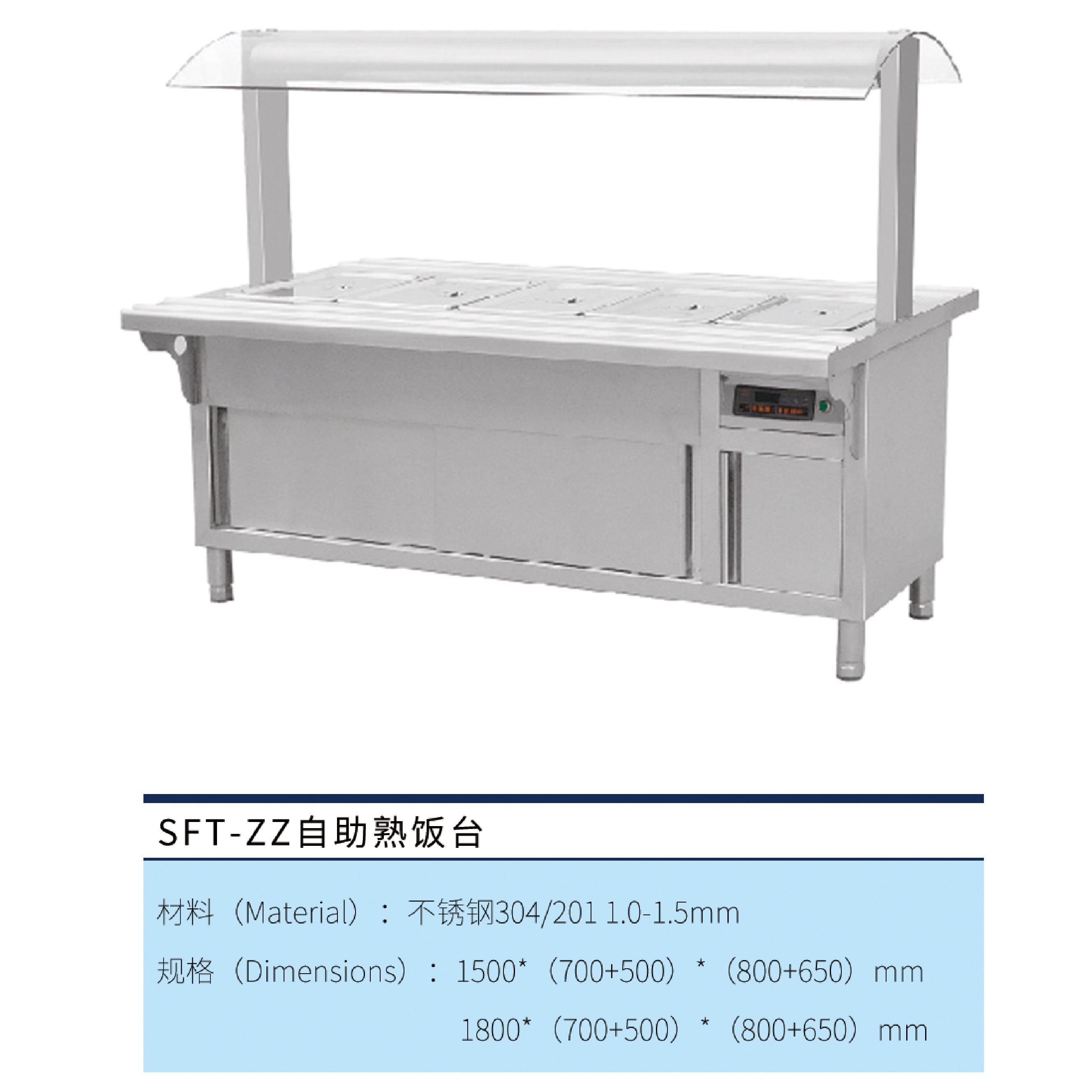 兩邊自助取餐設(shè)置餐盤滑道,柜體為推拉門增加儲(chǔ)物功能,臺(tái)面以上70cm為弧形玻璃防塵罩,保證干凈衛(wèi)生